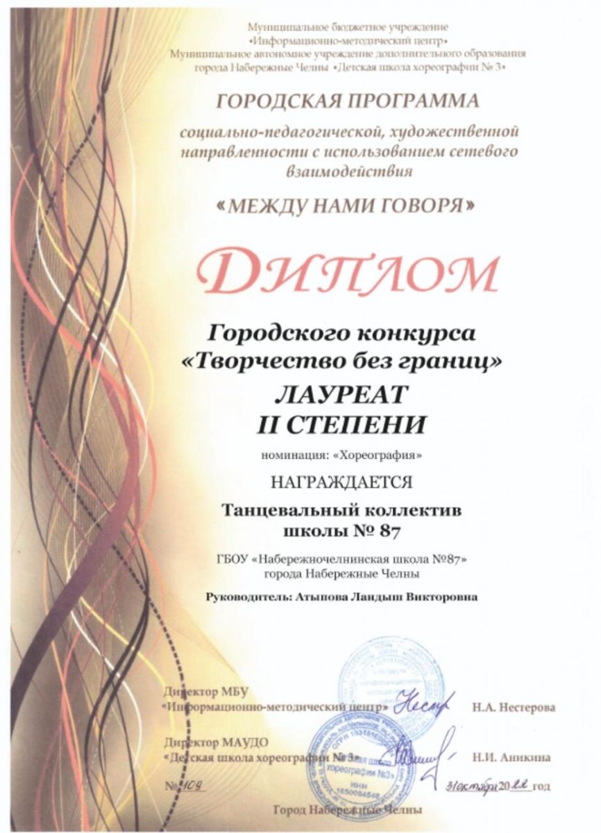 31.10.2022 года состоялся городской конкурс "Творчество без границ", где Ярмухаметов Даниэль, ученик 9 класса, занял 1 место, а танцевальный коллектив 4 класса- 2 место. Молодцы, поздравляем!