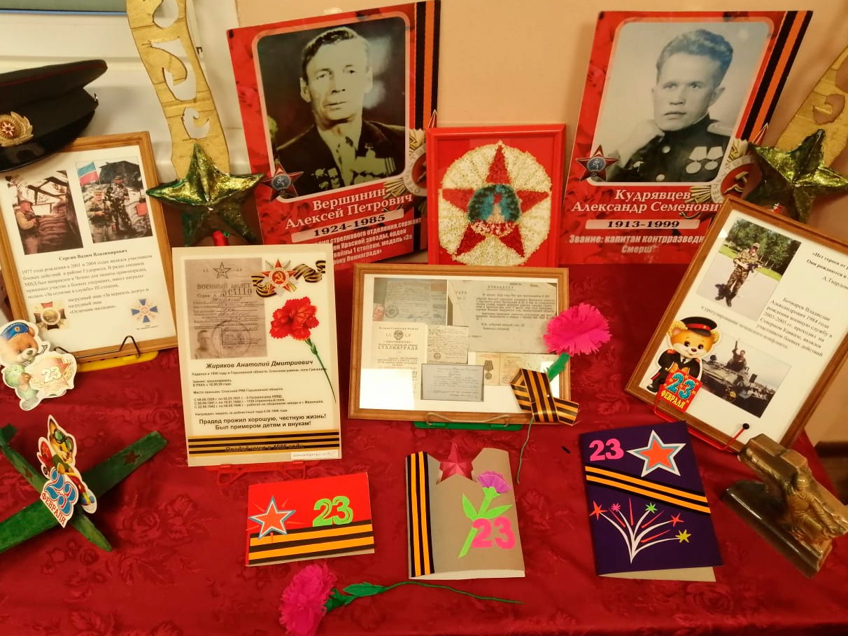 В рамках военно-патриотического месячника ребята Тимуровского отряда "Данко" оформили выставку "День памяти героев Отечества"