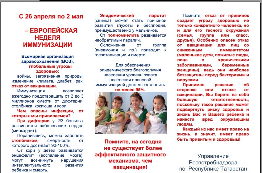Европейская неделя иммунизации ежегодно проводится во второй половине апреля, в этом году с 26 апреля по 2 мая. Целью акции является профилактика различных заболеваний, повышение информированности населения в вопросах медицины и пропаганда иммунопрофилактики. (Так называют метод индивидуальной или массовой защиты людей от инфекционных заболеваний путем создания или укрепления искусственного иммунитета при помощи различных вакцин).