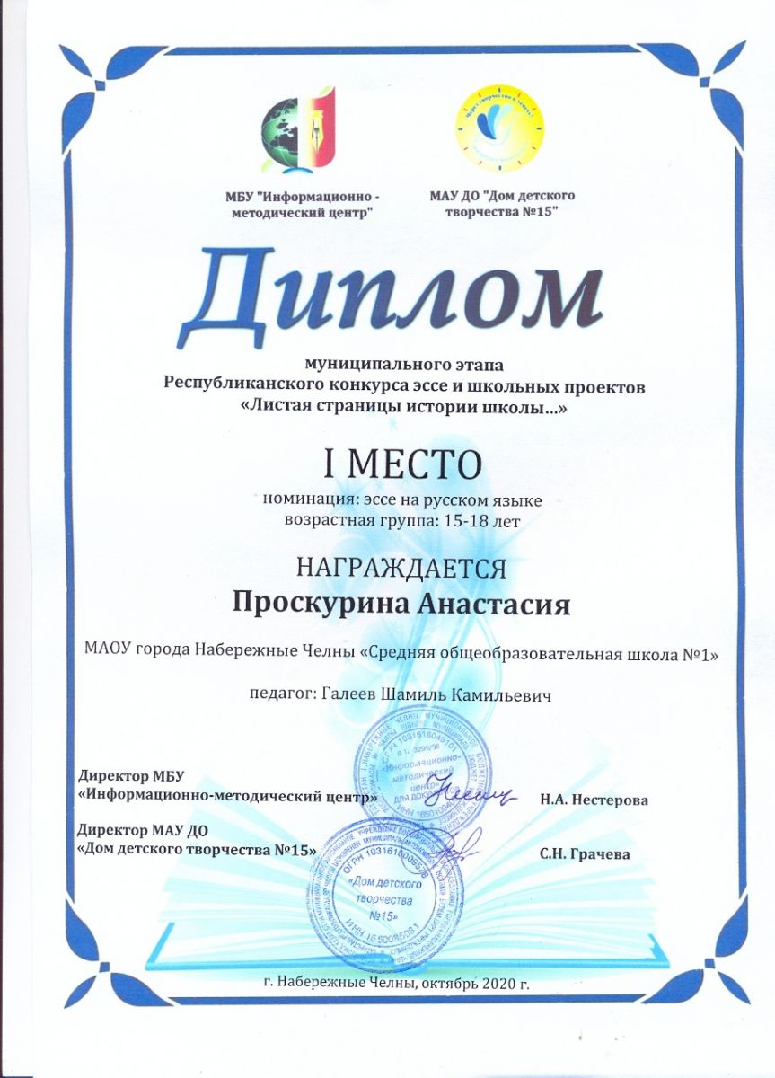 Проскурина Анастасия, ученица 9А класса приняла участие в муниципальном этапе Республиканского конкурса эссе и школьных проектов "Листая страницы истории школы..." и была награждена Дипломом 1 степени в номинации: эссе на русском языке (возрастная группа: 15-18 лет)