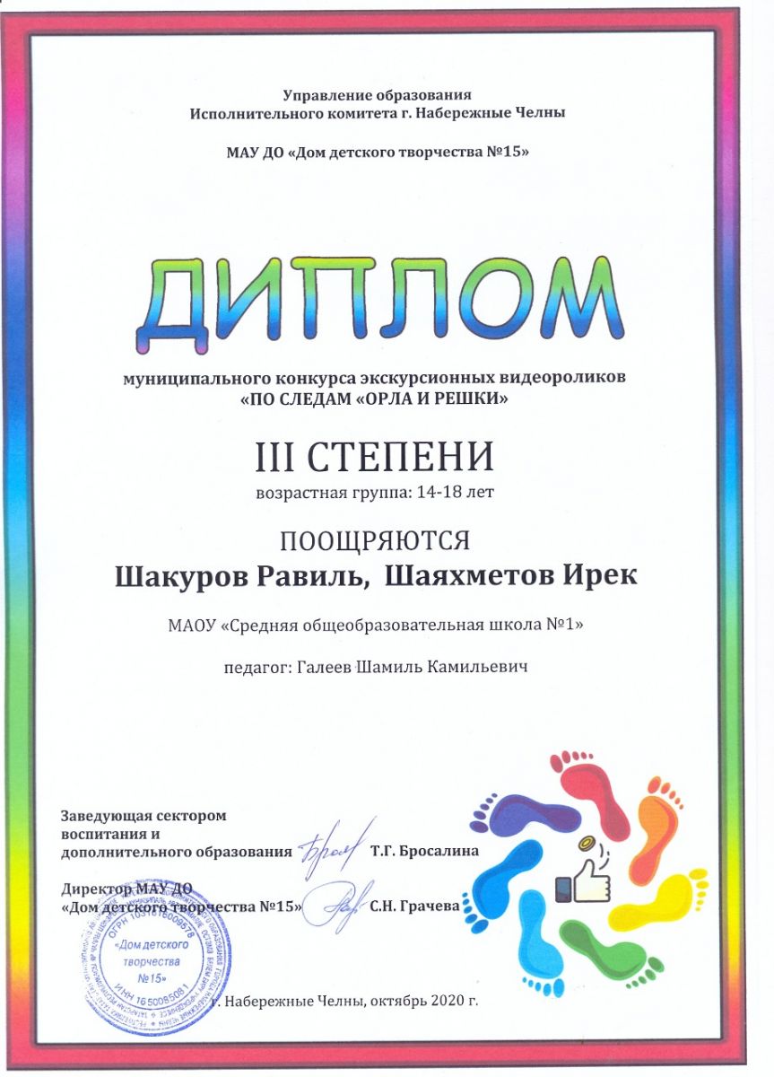 Учащиеся 8 класса Шакуров Равиль и Шаяхметов Ирек были награждены Дипломом 3 степени за участие в муниципальном конкурсе экскурсионных видеороликов "По следам "Орла и решки" (возрастная группа: 14-18 лет)
