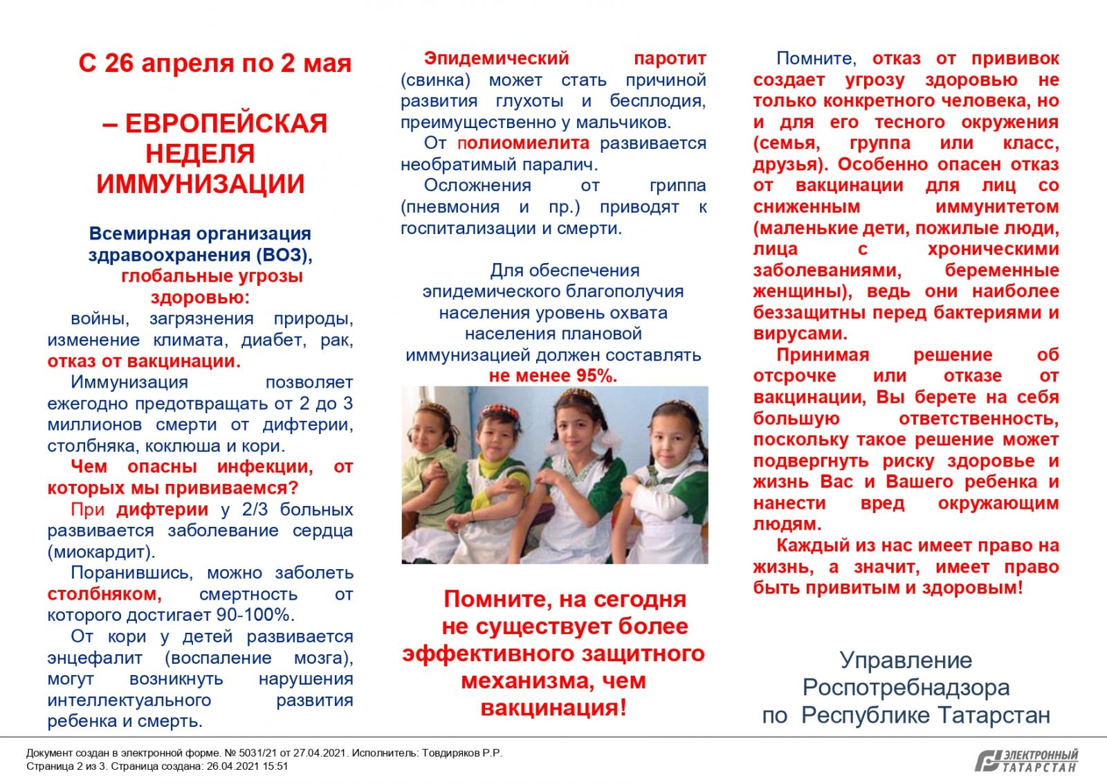 Опубликовано: 28.04.2021По инициативе Всемирной организации здравоохранения в Европе, в том числе в Российской Федерации и Республике Татарстан в период с 26 апреля по 2 мая 2021 г. проводится Европейская неделя иммунизации.