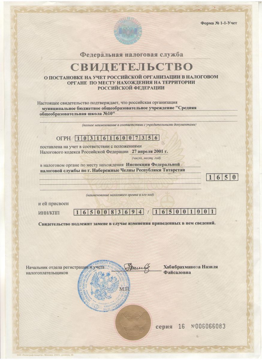 Свидетельство о постановке на учет Российской организации в налоговом органе по месту ее нахождения