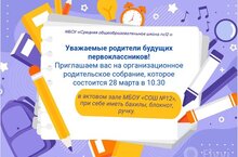 Приглашаем вас на организационное родительское собрание, которое состоится 28 марта в 10.30 ч. в актовом зале СОШ №12. С собой иметь бахилы, блокнот, ручку.