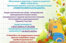 Акция заключается в сборе канцелярских принадлежностей для семей, находящихся в трудной жизненной ситуации. Не оставайтесь равнодушными. Примите участие. Акция проводится с 29.07.2020 по 31.08.2020. Канцелярские принадлежности принимаются на вахте школы.