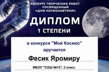 Мы поздравляем Фесик Яромира, ученика 2 "Б" класса c Дипломом I степени в конкурсе "Мой Космос".