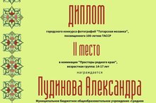 Сегодня поздравляем ученицу 10 "А" класса - Пудинову Александру с дипломом II степени в городском конкурсе фотографий "Татарская мозаика", посвященном 100-летию ТАССР. -