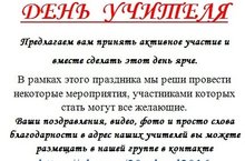 Впереди замечательный праздник День Учителя. Мы предлагаем вам принять участие в праздничных мероприятиях, в рамках этого дня. Следите за новостями в нашей школьной группе в соц.сети "ВКОНТАКТЕ" https://vk.com/20school2016