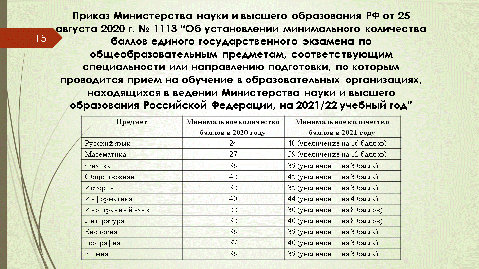 На 2021-2022 учебный год на основании Приказа Министерства науки и высшего образования РФ от 25 августа 2020 г. № 1113 “Об установлении минимального количества баллов единого государственного экзамена по общеобразовательным предметам, соответствующим специальности или направлению подготовки, по которым проводится прием на обучение в образовательных организациях, находящихся в ведении Министерства науки и высшего образования Российской Федерации, на 2021/22 учебный год” установлено минимальное количество баллов ЕГЭ по общеобразовательным программам для поступления в учреждения высшего образования РФ (по программам бакалавриата и программам специалитета).