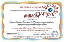 Поздравляем педагога дополнительного образования объединения "Родничок" Утябаеву Е.М. за подготовку Победителя Международного конкурса многожанровой культуры народов "Палитра культур"