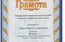 Поздравляем ученика 9г класса Вафина Марселя (учитель Ткачева А.Х.) занявшего III место в олимпиаде по математике (Наберережночелнинский институт КФУ) Молодец! 22.04.2016
