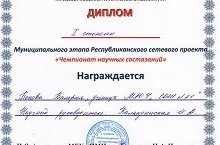 Поздравляем Попову Валерию, ученицу 9в класса (научный руководитель Каландинская И.А) с ПОБЕДОЙ в муниципальном этапе Республиканского сетевого проекта «Чемпионат научных состязаний» Так держать! 22.04.2016