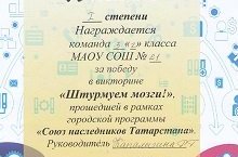 Поздравляем команду 3Г класса, научный руководитель Капалыгина Р.Г. за ПОБЕДУ в викторине «Штурмуем мозги!» в рамках городской программы «Союз наследников Татарстана» Молодцы! Так держать! 01.02.2016