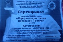 Артем Оганян занял первое место в городском конкурсе чтецов "Народа каждого язык прекрасен и велик"