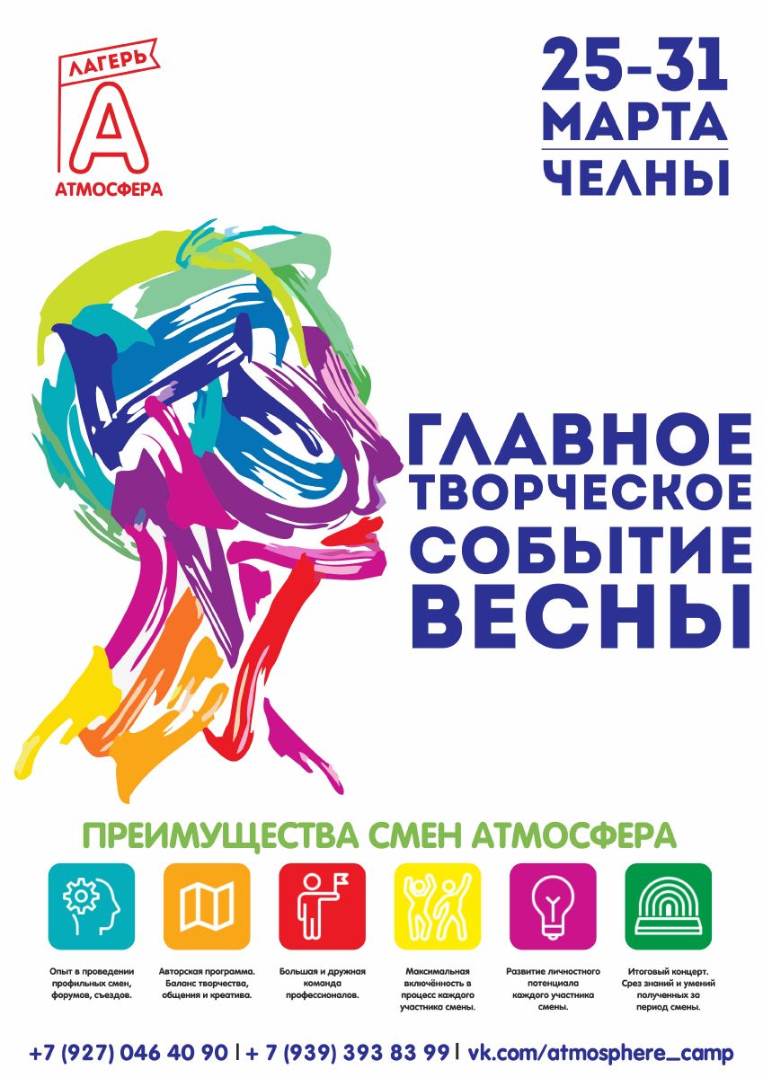 Автономная некомерческая организация "Центр содействия развитию интеллектуально-креативной личности Атмосфера" с 25 марта по 31 марта организует в г.Набережные Челны профилбную смену "Творчество". Основными направлениями прфильной смены являются: танцы, оригинальный жанр, дизайн, блогинг.
