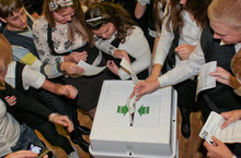 Все ученики нашей школы приходят на голосование. Каждый ученик подходит к столу , находит свою фамилию в списке класса, расписывается против своей фамилии, получает бюллетень, проходит в кабину, ставит галочку против фамилии кандидата, за которого отдает свой голос, только за одного. Бросает свой бюллетень в урну.