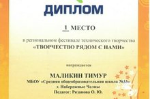 Поздравляем ученика 2В класса Маликова Тимура с победой в региональном фестивале технического творчества "Творчество рядом с нами". Молодец!!! Так держать!!! Желаем новых творческих идей и их воплощения!