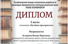 Бухараева Венера Фаруковна, руководитель школьного музея и учитель родного языка МАОУ «СОШ №34 с УИОП», заняла I место в Республиканском конкурсе методических разработок по реализации образовательного потенциала школьного музея «Новые возможности».