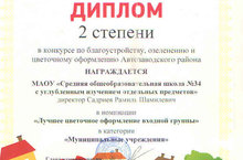 Наша школа награждена дипломов 2 степени, за участие в конкурсе по благоустройству, озеленеию и цветочному оформлению входной группы среди Муниципальных учреждений Автозаводского района. Поздравляем с достойной победой и желаем дальнейших творческих идей!