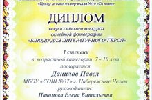Учащийся 3в класса Данилов Павел (кл.рук. Пахомова Е.В.) награждён дипломом I степени Всероссийского конкурсасемейной фотографии "Блюдо для литературного героя".