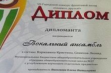 Учащиеся 4 в класса (кл. рук. Пахомова Е.В.) Каржавина Кристина и Семенов Леонид успешно выступили на городском конкурсе фронтовой песни "Споёмте, друзья". Молодцы, ребята!