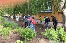 С 1 по 30 июня в школе работают трудовые бригады. Это ребята 7 и 8 классов. Они с удовольствием облагораживают территорию любимой школы. -