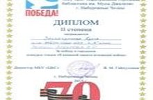 Муса Җәлил исемендәге Үзәк китапханәдә Бөек Җиңүнең 70 еллыгы уңаеннан "В книжной памяти мгновения войны" дигән исем астында шигырь конкурсы булып үтте. 4 нче "А" сыйныфы укучысы Зәйнетдинова Әдилә 2 нче дәрәҗә дипломга лаек булды. Әдиләгә, китапханәче Нурлыгаянова Әлфия Миргазиян кызы һәм башлангыч сыйныфлар укытучысы Япбарова Зөлфия Рәис кызына рәхмәт белдерәбез, уңышлар телибез.
