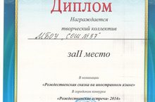 Поздравляем учащихся 5-х классов Домрачеву С., Ермуллину А., Клочкова Р., Кордюкову К., Кузнецову Э., Лаврентьеву Д., Скибину К., Тишкина И., занявших 2-е место в городском творческом конкурсе "Рождественские встречи-2014". Выражаем благодарность учителю английского языка Тухфатуллиной Г.М.