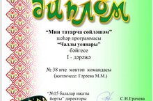 28 января в МАУДО "ДДТ №15" был проведён четвёртый тур городского конкурса, посвященный 400-летию города Набережные Челны "Чаллы уеннары" в рамках досуговой программы «Мин татарча сөйләшәм». По итогам конкурса команда была награждена дипломом I степени (Руководитель Гараева М.М., учитель родного языка и литературы).