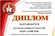 21 ноября подведены итоги творческого конкурса посвященного «Дню матери» городской военно-патриотической программы "Патриоты Челнов", которую проводил Дом детского творчества № 15. В конкурсе приняли участие команды 5 в и 9 в классов под руководством Мурзайкина Анатолия Алексеевича. Обе команды получили дипломы за 2 место. Поздравляем участников и желаем дальнейших творческих успехов.
