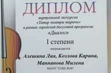 2019 нчы елның 22 ноябрендә Муниципаль автоном белем бирү оешмасы “16 нчы санлы Балалар иҗат йорты” милли мәдәният һәм сәнгать бүлегендә “Диалог” программасы буенча уздырылган икенче тур «Татар театры тарихы» дип аталган бәйге булды. Бәйге татар театрының тарихына багышланды. Конкурста 5 г сыйныфындагы рус телле укучылар катнашты: Алешина Лия, Маннанова Милена, Козлова Карина. (Җитәкчесе: Гәрәева М.М.) Команда 5-6 сыйныф укучылары арасында I нче дәрәҗәдәге диплом белән бүләкләнде.