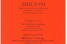 В фестивале принял участие ученик 10А класса Шагиев Райнур (под руководством учителей технологии Вавилова В.Г. и Халиуллиной Е.В.) со своей работой «Ретроавтомобиль: ЗИС-5». В возрастной группе 16-18 лет в номинации НТМ - Автомоделирование Райнур занял 1 место.