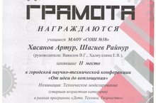 В марте 2019 года состоялась городская научно-техническая конференция “От идеи до воплощения”, организованная МАУ ДО “Центр детского технического творчества №5”, в рамках программы “Дети. Техника. Творчество”. Ученики 9В класса Шагиев Райнур и Хасанов Артур в номинации «Техническое моделирование» получили грамоту за второе место, ученики 8Б Мишустина Ангелина и 7А Шатов Владислав – сертификат участника. Поздравляем призеров!