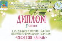 В апреле 2019 года состоялся региональный конкурс-выставка “Весенняя капель”, организованный управлением образования и по делам молодежи исполнительного комитета города Набережные Челны МАУ “Центр подростково-молодёжных клубов “Подросток”. Ученики Мустафин Алмаз (6 Б класс) получил диплом 1 степени, Сергеева Ангелина (8Б класс) – диплом 1 степени, Харисова Ландыш (8Б класс) – диплом 3 степени, Токарева Дарья (8В класс) и Мишустина Ангелина (8Б класс) – диплом участника. Работы учеников к выставке выполнялись под руководством учителей технологии Вавилова В.Г. и Халиуллиной Е.В. Поздравляем победителей и призеров!