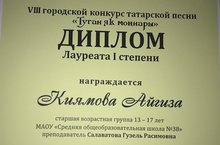 28 ноября 2018 года в МАУ ДО «Детская школа искусств №7» состоялся VIII городской конкурс татарской песни «Туган як моңнары», в котором участвовали учащиеся нашей школы ученица 10а класса Киямова Айгиза Ринасовна (учитель Салаватова Г.Р.) и ученица 3в класса Сайфетдинова Дарина Динаровна (учитель Гафарова Ф.Ш.) в номинации “Эстрадная песня. Киямова Айгиза Ринасовна награждена дипломом I степени, Сайфетдинова Дарина Динаровна награждена дипломом II степени.