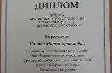 Ученица 3 а класса Ионова Мария в муниципальной олимпиаде по русскому языку для учащихся 3-х классов заняла 2 место и была награждена дипломом призёра. Поздравляем нашу Марию. Молодец!