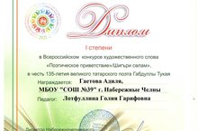 Апрель традиционно принято считать месяцем Габдуллы Тукая . Для каждого он идеал порядочности, творческой мысли и, что особенно важно, проводник родного языка, основоположник татарского литературного слова. Так совпало, что 26 апреля в Татарстане праздновалось сразу два крупных события - 135-летие со дня рождения Габдуллы Тукая и День родного языка. Не только в своей школе ученики и учителя достойно отметили эти даты, но и свои работы представили во Всероссийском конкурсе “Поэтическое приветствие”.