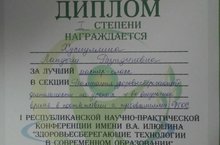 В рамках реализации Указа Президента РФ 240 от 29.05.2017" Об объявлении в Российской Федерации десятилетия детства"в части внедрения здоровьеосберегающих технологии,в городе Лениногорск 20 марта 2019 прошла 1 республиканская научно-практическая конференция имени В.А Илюшина" Здоровьесберегающие технологии в современном образовании". Наш педагог Хуснуллина Ландыш Разтдиновна провела мастер-класс в секции "Реализация здоровьесберегающей деятельности на уроках и во внеурочное время в соответствии с требованиями ФГОС" и награждена дипломом первой степени. Поздравляем с победой, желаем творческих успехов!