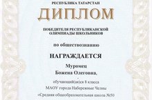 ПОБЕДИТЕЛЕМ РЕСПУБЛИКАНСКОЙ ОЛИМПИАДЫ ШКОЛЬНИКОВ ПО ОБЩЕСТВОЗНАНИЮ СТАЛА НАША УЧЕНИЦА 8 КЛАССА «Б» МУРОМЕЦ БОЖЕНА ОЛЕГОВНА.