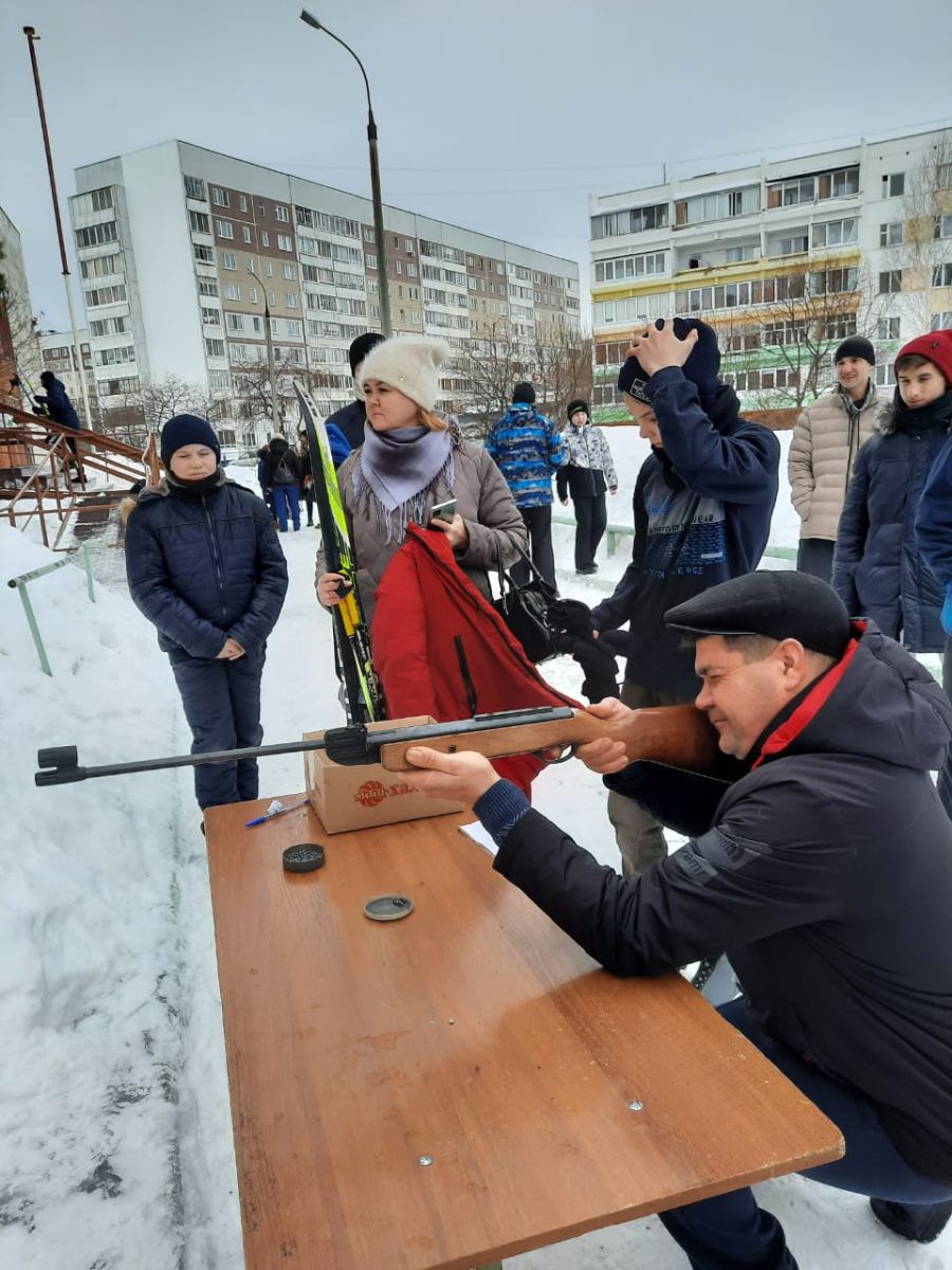13 февраля перед школой прошел спортивный праздник «Парад Отцов». «Парад отцов» – это спортивно-развлекательное мероприятие с элементами шествия и возможностью совместного участия в прохождении этапов соревнования отцов с детьми. На празднике приняло участие команда в составе отца и сына. Папам с детьми было предложены для прохождения 6 этапов:стрельба,лыжи,метание шайбы в ворота,бросок мяча в обруч ,бросок мяча в кольцо, подтягивание и отжимание.