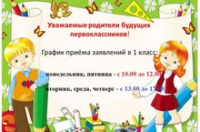 График приема документов для зачисления в 1 класс: понедельник, пятница - 10.00 ч. до 12.00 ч.; вторник, среда, четверг - 13.00 ч. до 17.00 ч..