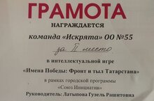 В рамках городской программы “СОЮЗ ИНИЦИАТИВ” команда “Искрята” под руководством Латыповой Г.Р. приняла участие в интеллектуальной игре “Имена Победы: Фронт и Тыл Татарстана” и получили грамоту за 2 место. Поздравляем команду школы и её руководителя Латыпову Г.Р.