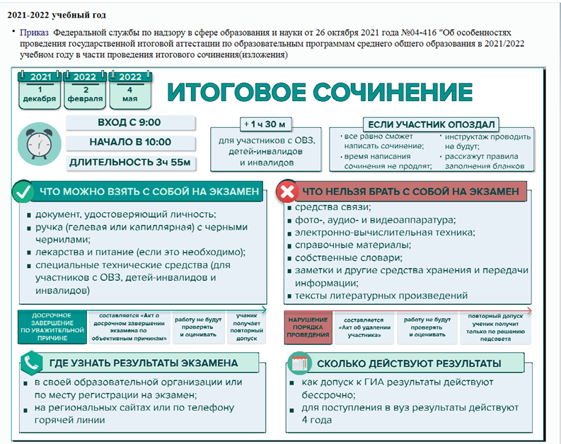 Об особенностях проведения государственной итоговой аттестации по образовательным программам среднего общего образования в 2021/2022 учебном году в части проведения итогового сочинения (изложения)
