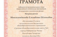 Поздравляем Мингазетдинову Елизавету, ученицу 8А класса, победителя муниципального этапа всероссийской олимпиады школьников по физике.