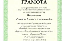 Поздравляем Симакина Максима, ученика 8Б класса, призёра муниципального этапа всероссийской олимпиады школьников по физической культуре.