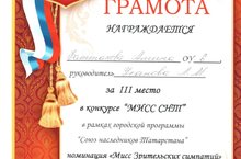 В рамках реализации городской программы Союз наследников Татарстана в Детско-юношеском центре № 14 прошел конкурс «Мисс СНТ». Ученица 6А класса Фаттахова Амина (рук. Усанова Л.М.) достойно выступила, завоевав звание «Мисс зрительских симпатий», и заняла 3 место. Поздравляем!