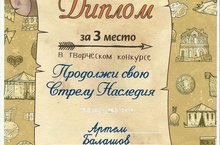 В 2015/2016 году стартовал Республиканский проект «Культурный дневник школьника» для учащихся 1-4 классов. Ребята в течение года могут посещать культурные учреждения города и республики и делиться своими впечатлениями в сообществе www.культурныйдневник.рф. В марте проходил творческий конкурс «Продолжи свою Стрелу Наследия» по одноименному мультфильму (Татармультфильм) по итогам которого ученик 3Г класса Балашов Артём занял 3 место. Поздравляем! А всем ребятам желаем присоединиться к данному проекту и проявить свои литературные способности.