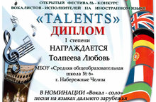 От всей души поздравляем Толпееву Любовь (обучающуюся 8Б класса, рук. Назарова Т.Ю.), которая заняла 1 место в конкурсе иностранной песни "TALENTS".
