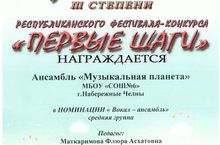 13 февраля в ГДТД и М №1 состоялся гала – концерт республиканского конкурса «Первые шаги». Вокальный ансамбль «Музыкальная планета» (руководитель Маткаримова Ф.А.) стал лауреатом 3 степени, а также дипломантом стала солистка ансамбля: Галимзянова Элина завоевала диплом 1 степени. Поздравляем! Молодцы!