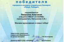 Паюршина Анастасия стала победителем в городском конкурсе социальных баннеров «Ликуй Победа!». Поздравляем и желаем дальнейших успехов и достижений!